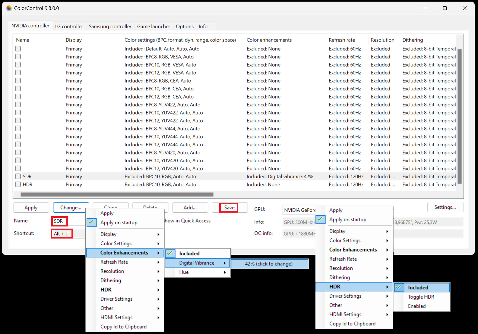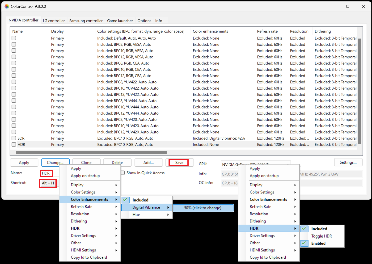 1.HDR on, digital vibrance 50